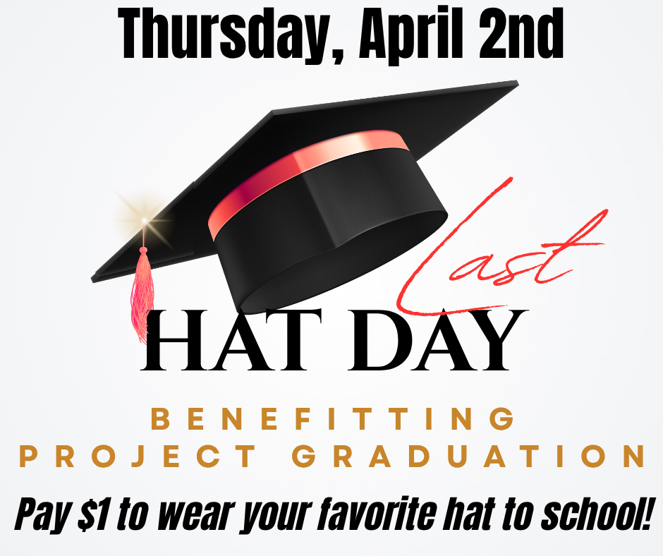 Hat Day - April 2nd - Last Project Grad Hat Day of the Year Last Project Graduation Hat Day of the year!Wear a hat on Thursday, April 2 for just $1All proceeds go to Project Graduation! March 30, 2026